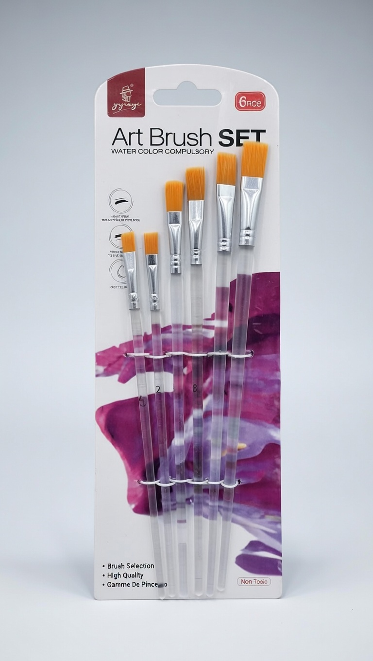 6-piece set featuring clear handles and yellow synthetic bristles. While labeled as “watercolor compulsory,” these flat and round brushes are also suitable for acrylic and oil painting