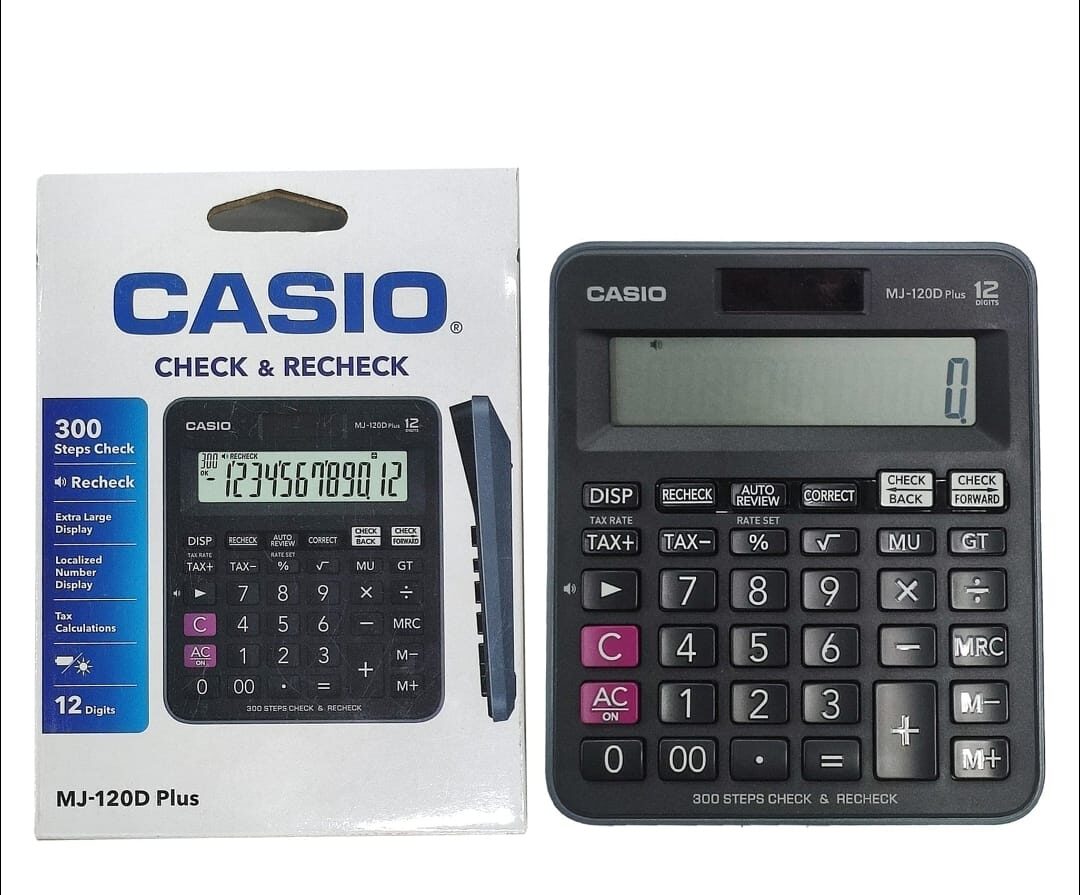 A 12-digit mini desktop calculator featuring a 300-step check and recheck function, tax calculation keys, and dual power (solar and battery).