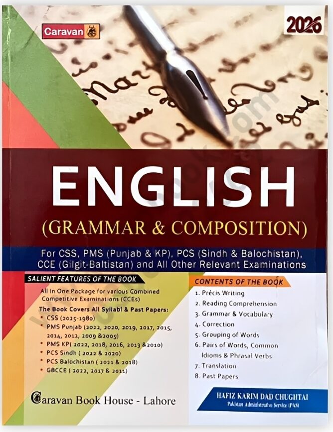 ENGLISH (Grammar & Composition) 2026 Edition by Hafiz Karim Dad Chughtai, published by Caravan Book House, is a complete and all-in-one preparation guide for candidates appearing in CSS, PMS, PCS, GBCCE, and other Combined Competitive Examinations (CCEs).